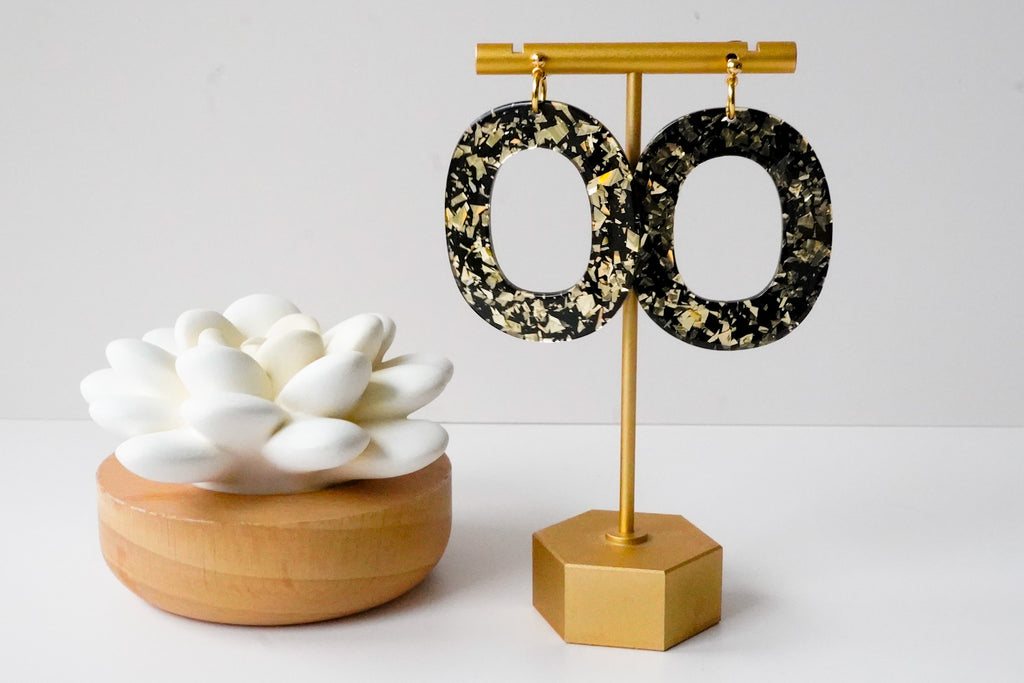 Channel your inner fashionista with these bold Black and Gold Statement Earrings. These large oval earrings are the perfect accessory for any occasion - from parties to holidays - adding a touch of glam to any outfit. Elevate your style and make a statement with these must-have earrings.